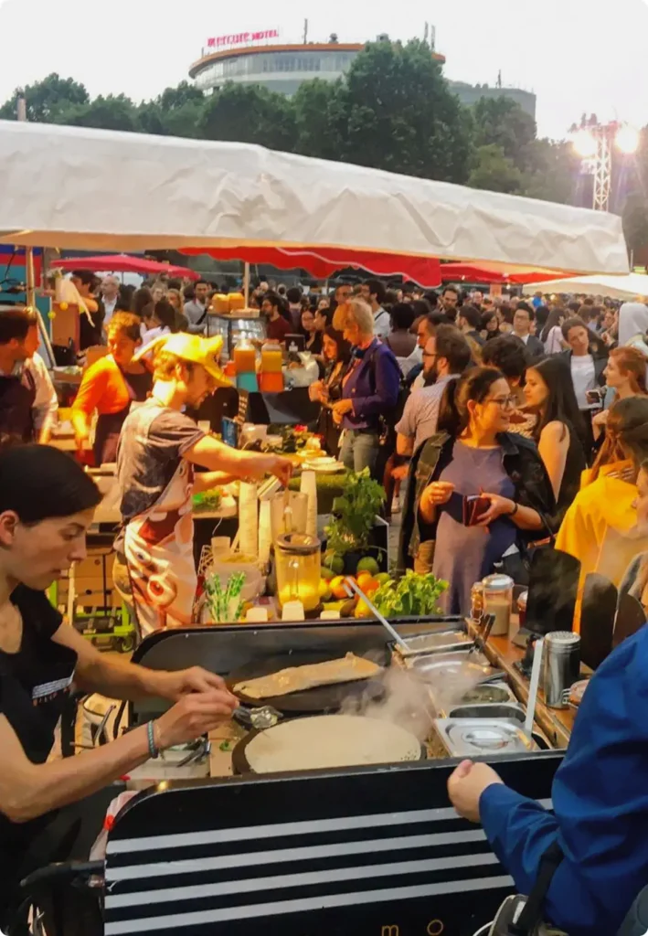 On cuisine sur place et on sert une formule mobile, rapide et conviviale, parfaite pour les mariages, événements d’entreprise, cocktails, festivals ou fêtes de quartier.